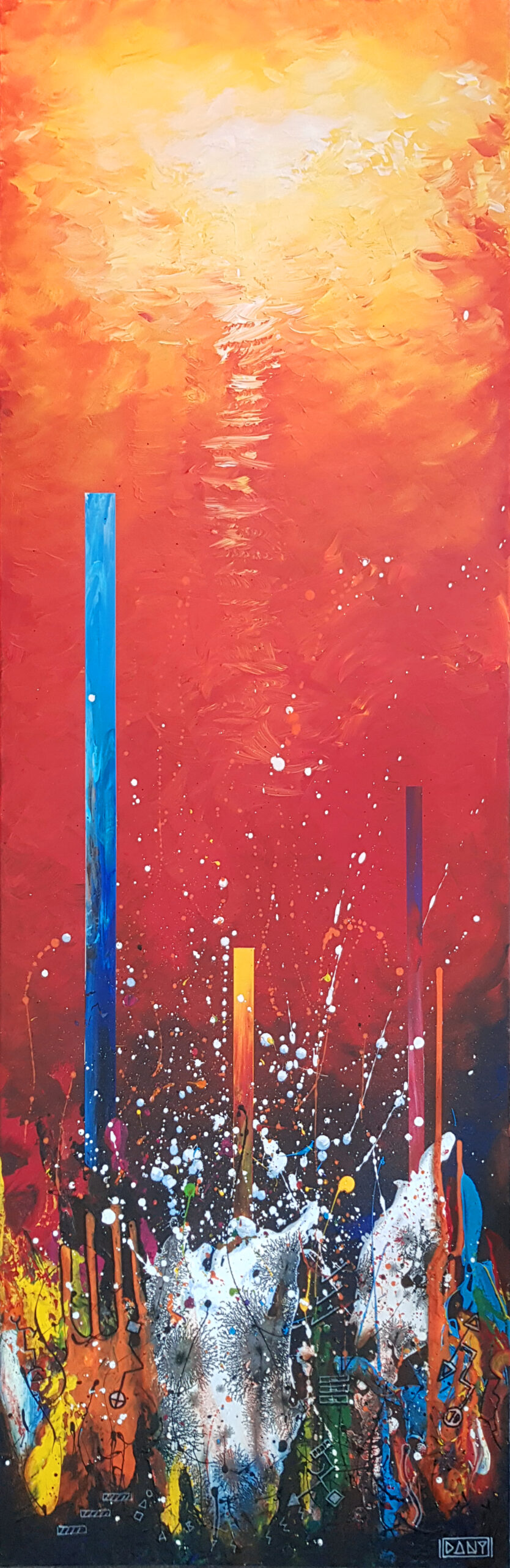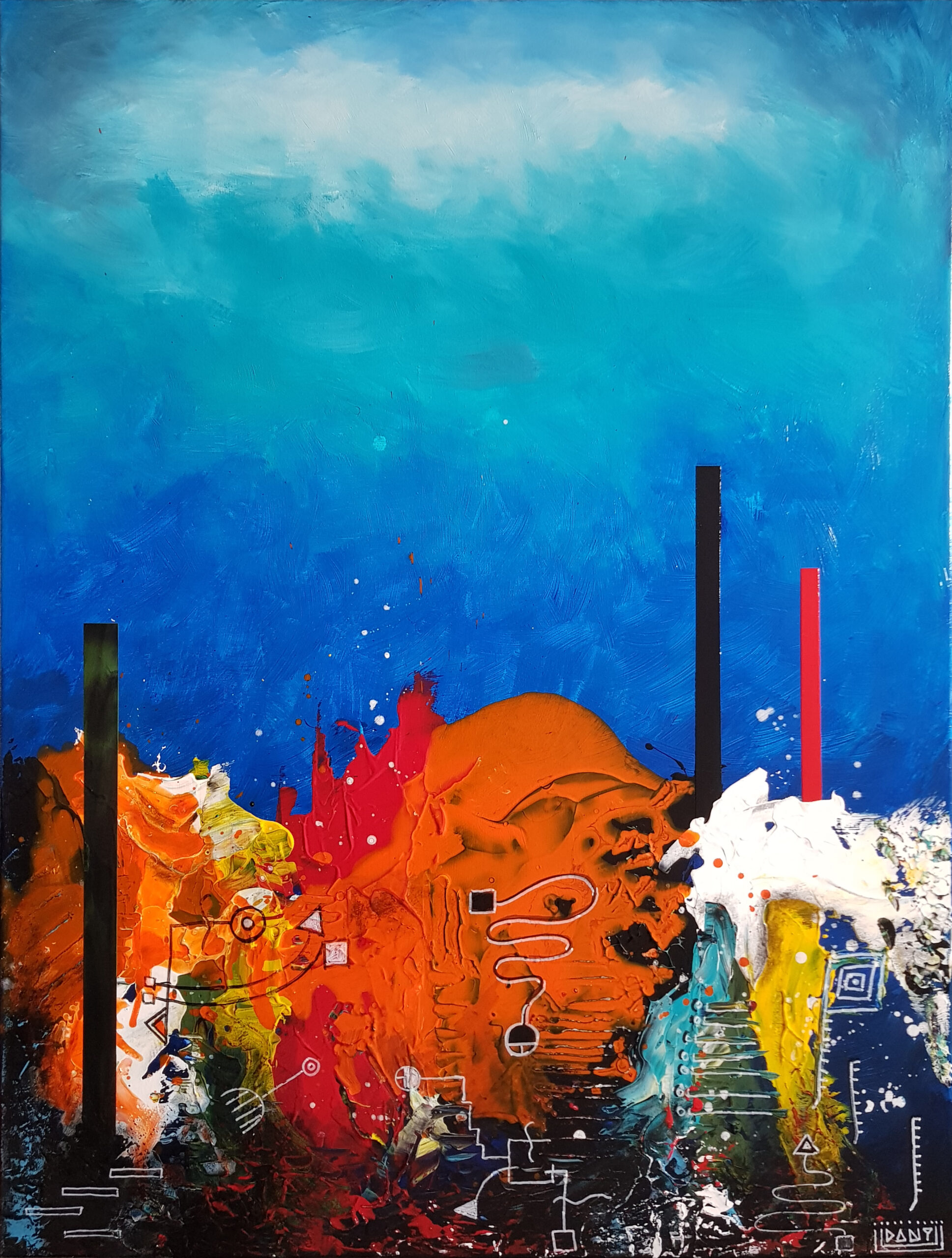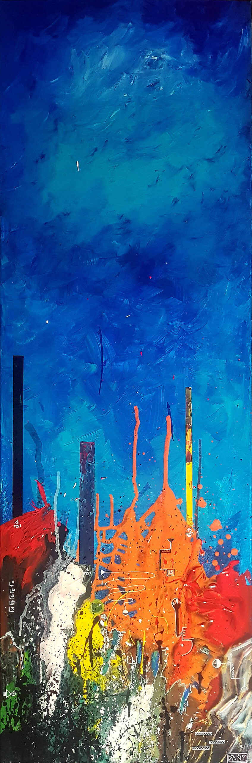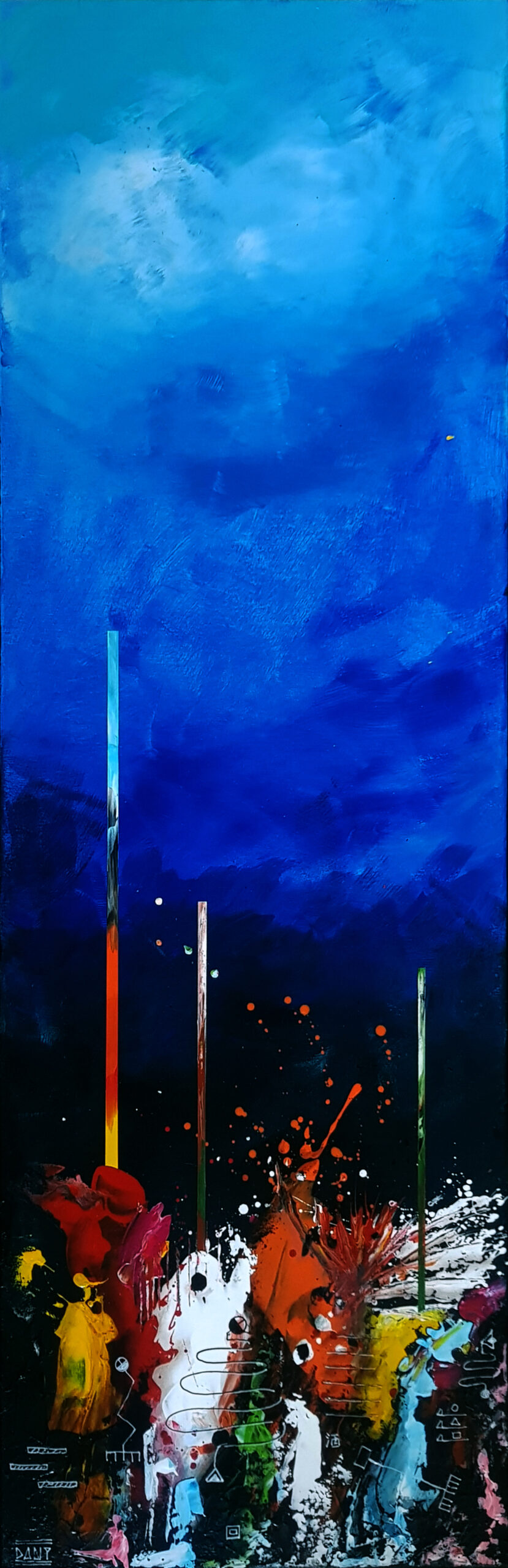 Au cœur de ces profondeurs, l’artiste fait surgir des monolithes énigmatiques, sentinelles dressées contre l’immensité de la « grande bleue ». Ces formes verticales, à la fois organiques et géométriques, interrogent sur l’origine d’un monde dont les bâtisseurs auraient disparu, ne laissant derrière eux que des vestiges chromatiques vibrants. Entre l’obscurité des fonds et l’éclat des coraux abstraits, Zarlor nous invite à une archéologie de l’imaginaire, où chaque toile devient le seuil d’une cité engloutie.