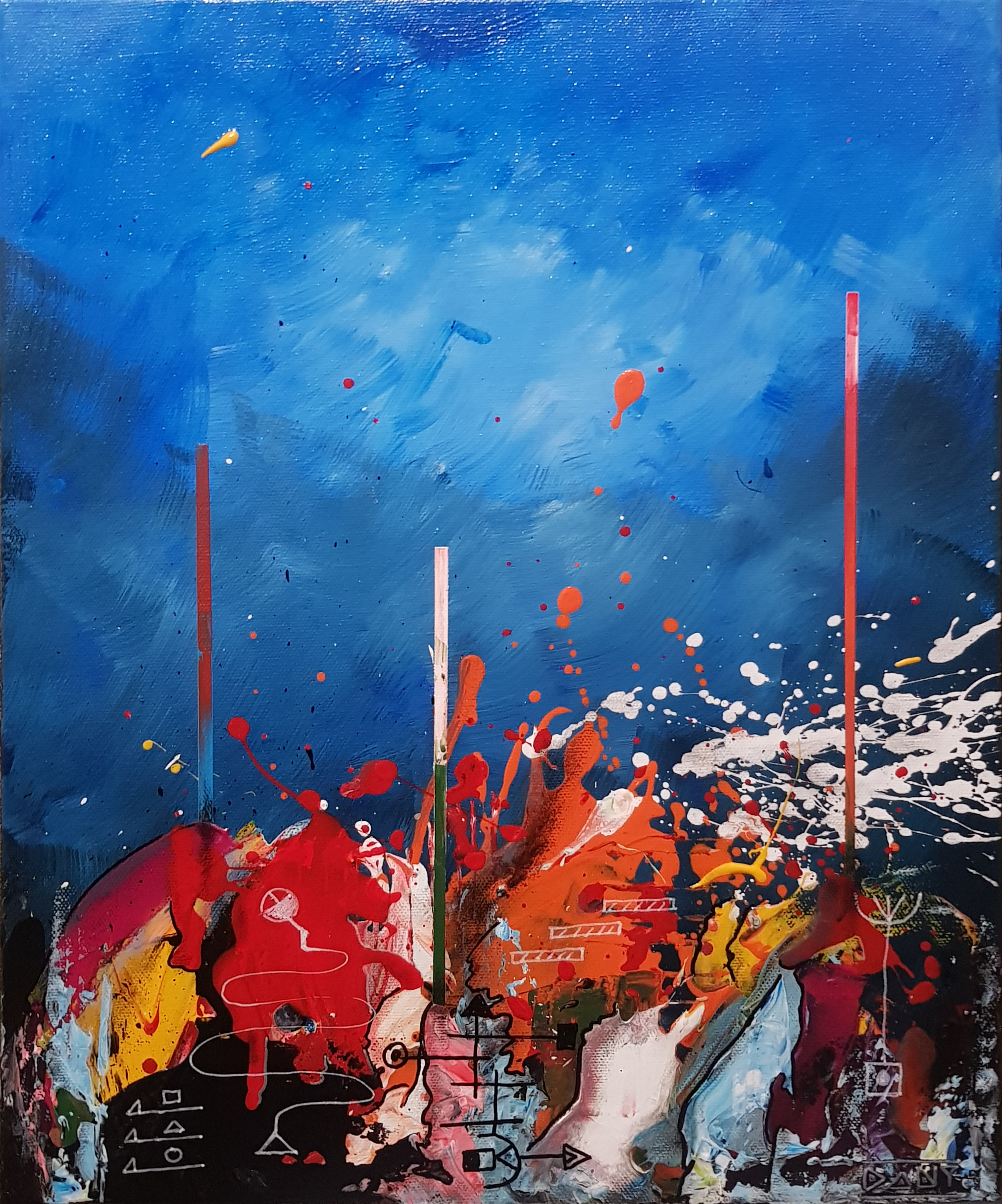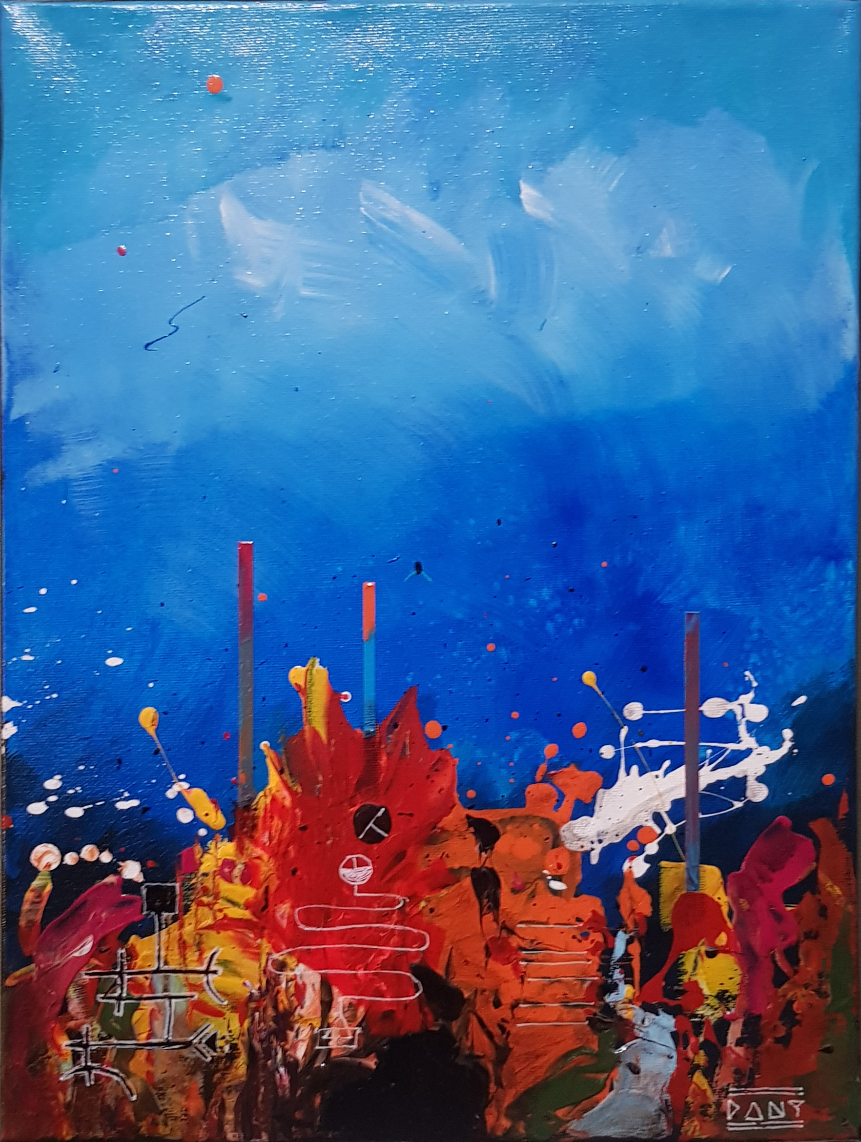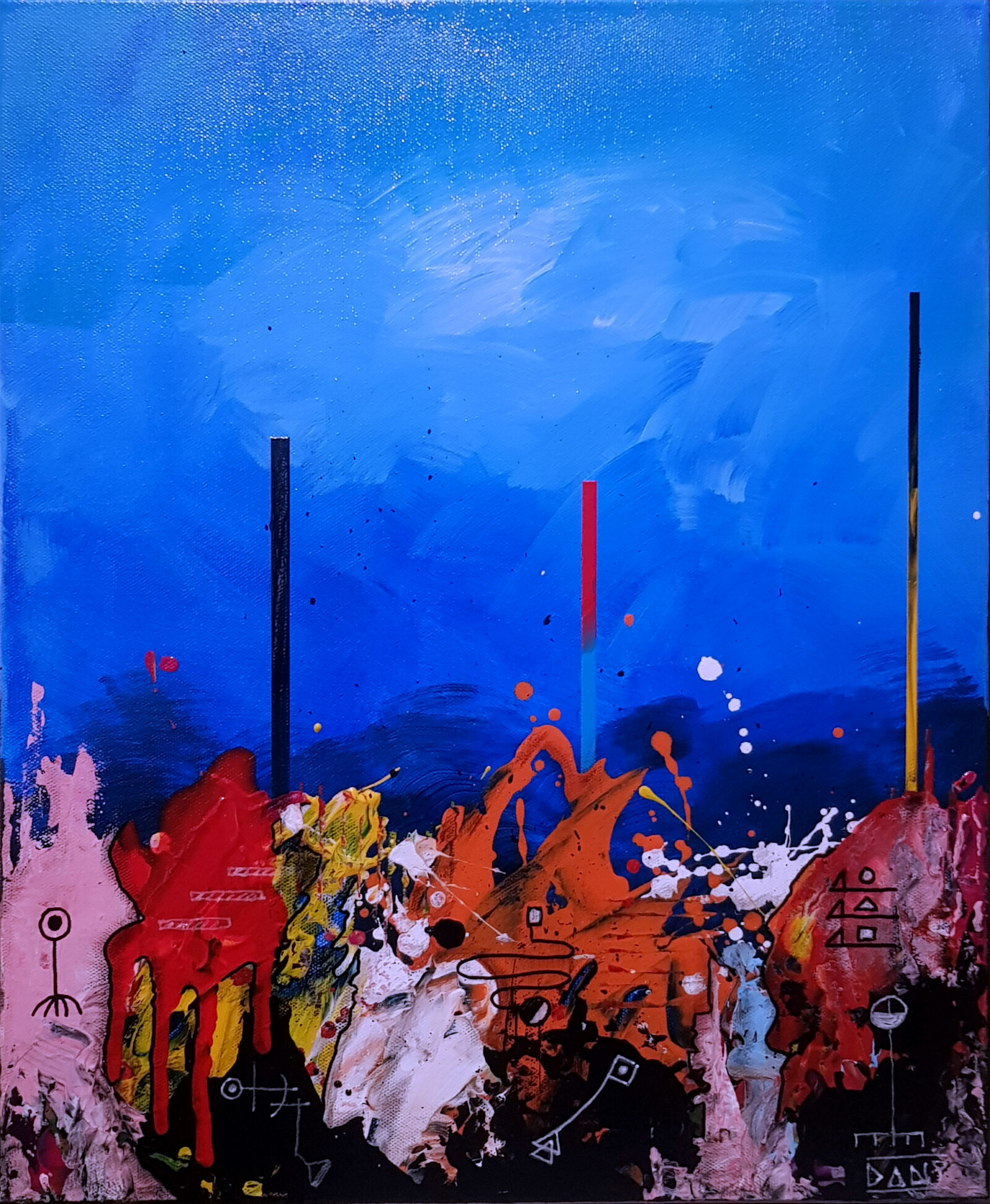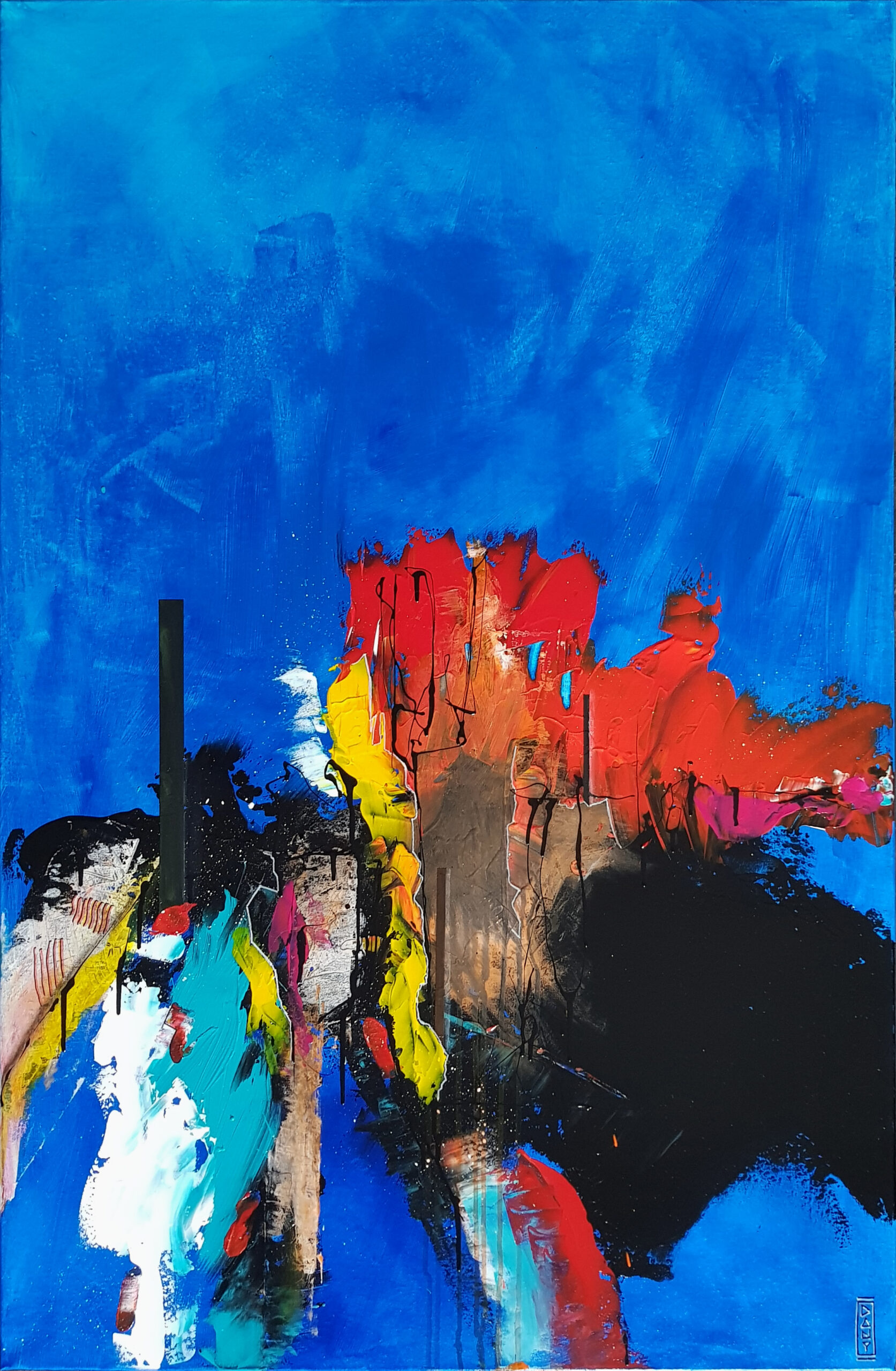 Au cœur de ces profondeurs, l’artiste fait surgir des monolithes énigmatiques, sentinelles dressées contre l’immensité de la « grande bleue ». Ces formes verticales, à la fois organiques et géométriques, interrogent sur l’origine d’un monde dont les bâtisseurs auraient disparu, ne laissant derrière eux que des vestiges chromatiques vibrants. Entre l’obscurité des fonds et l’éclat des coraux abstraits, Zarlor nous invite à une archéologie de l’imaginaire, où chaque toile devient le seuil d’une cité engloutie.