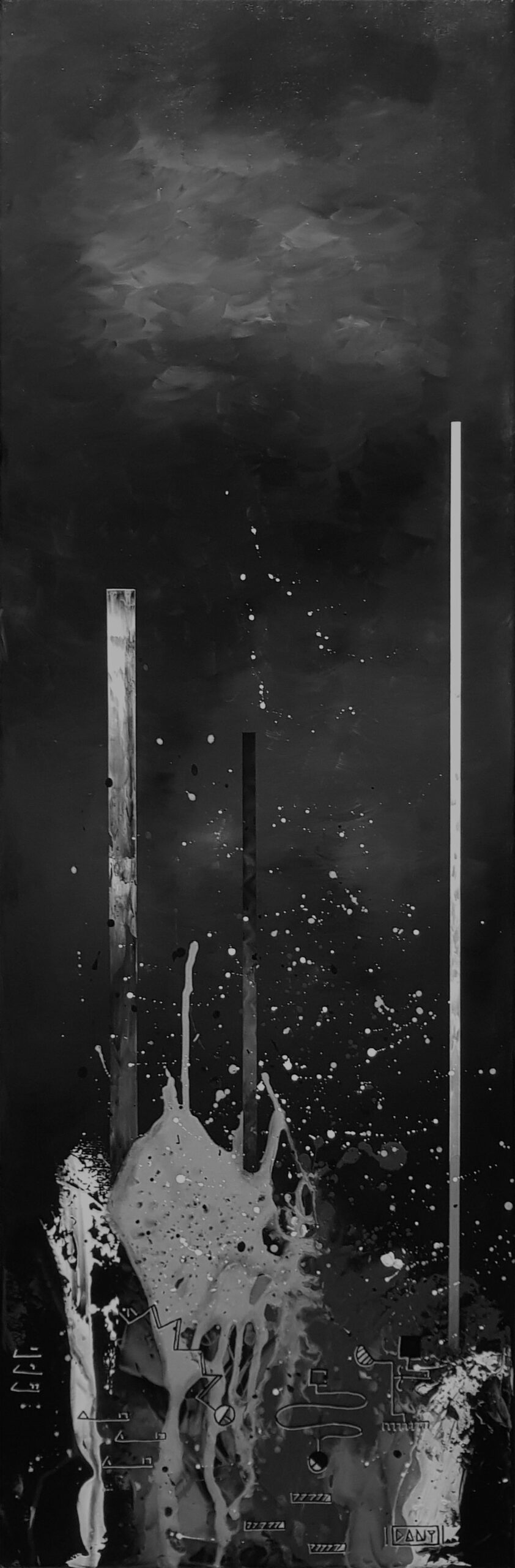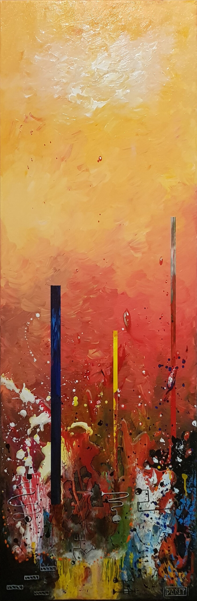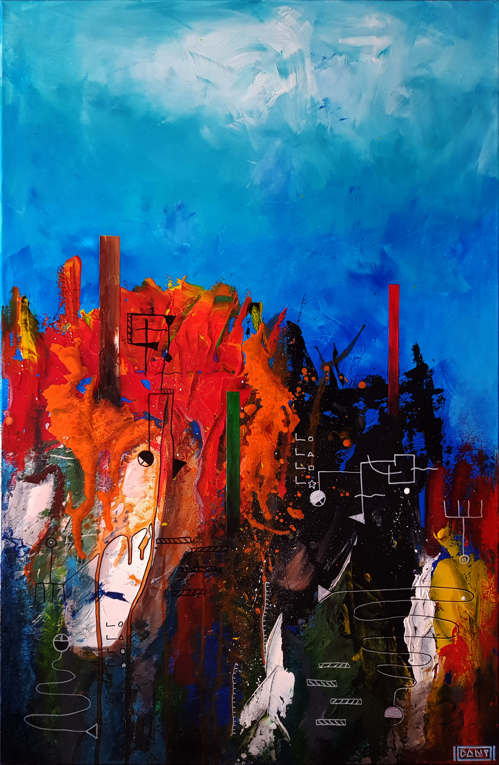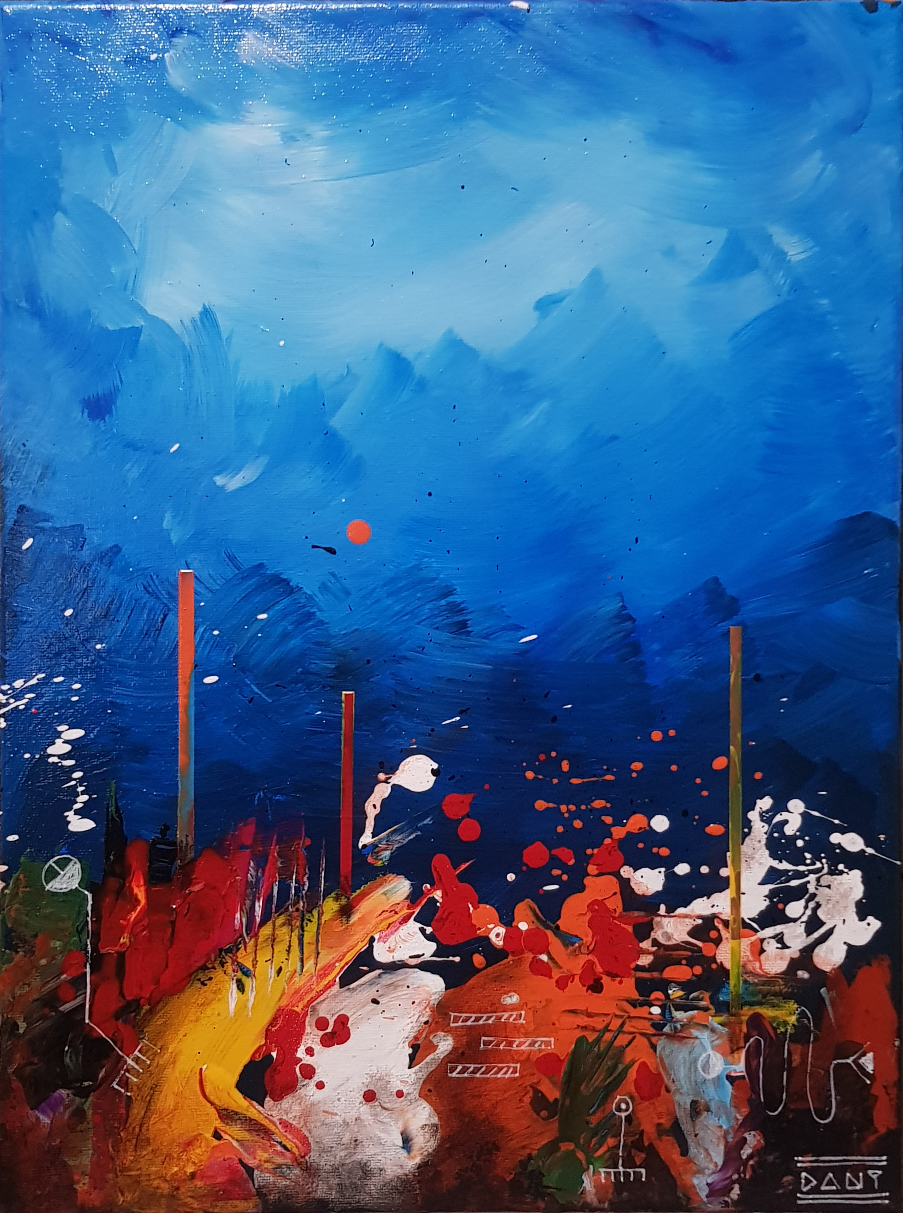 Au cœur de ces profondeurs, l’artiste fait surgir des monolithes énigmatiques, sentinelles dressées contre l’immensité de la « grande bleue ». Ces formes verticales, à la fois organiques et géométriques, interrogent sur l’origine d’un monde dont les bâtisseurs auraient disparu, ne laissant derrière eux que des vestiges chromatiques vibrants. Entre l’obscurité des fonds et l’éclat des coraux abstraits, Zarlor nous invite à une archéologie de l’imaginaire, où chaque toile devient le seuil d’une cité engloutie.