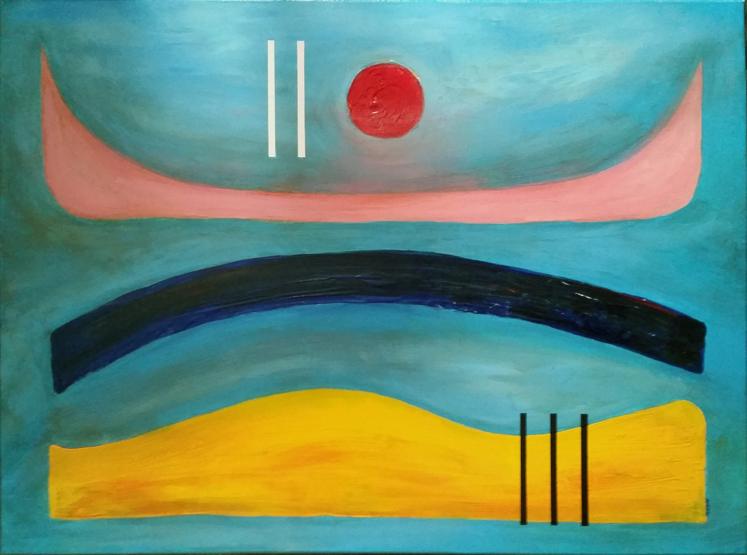 Ces paysages, dépouillés de toute anecdote, invitent à une contemplation phénoménologique. Le spectateur n’est plus face à une image, mais immergé dans une harmonie chromatique puissante où l’horizon devient une vibration pure. Entre tensions graphiques et équilibres suspendus, chaque œuvre de la série devient le théâtre d’une méditation silencieuse, une quête d’absolu où la simplification extrême permet paradoxalement d’atteindre la plénitude du ressenti.