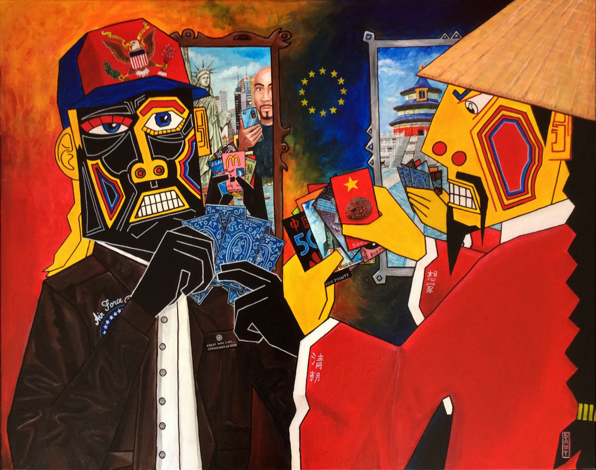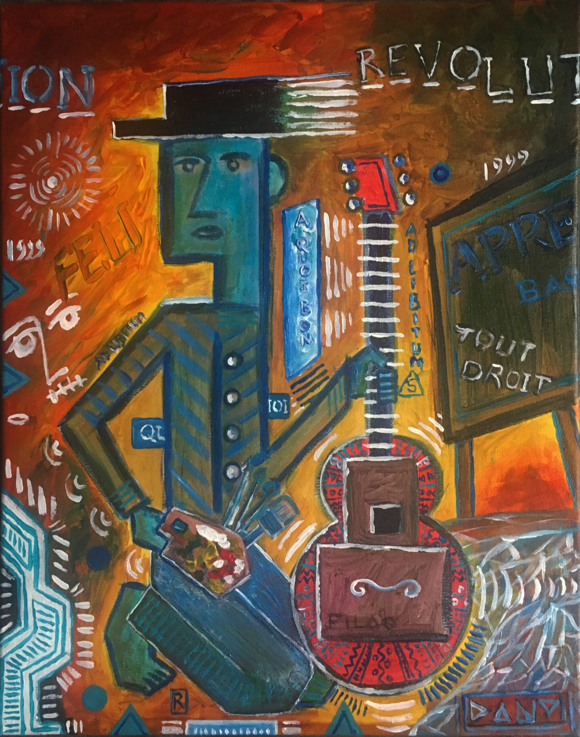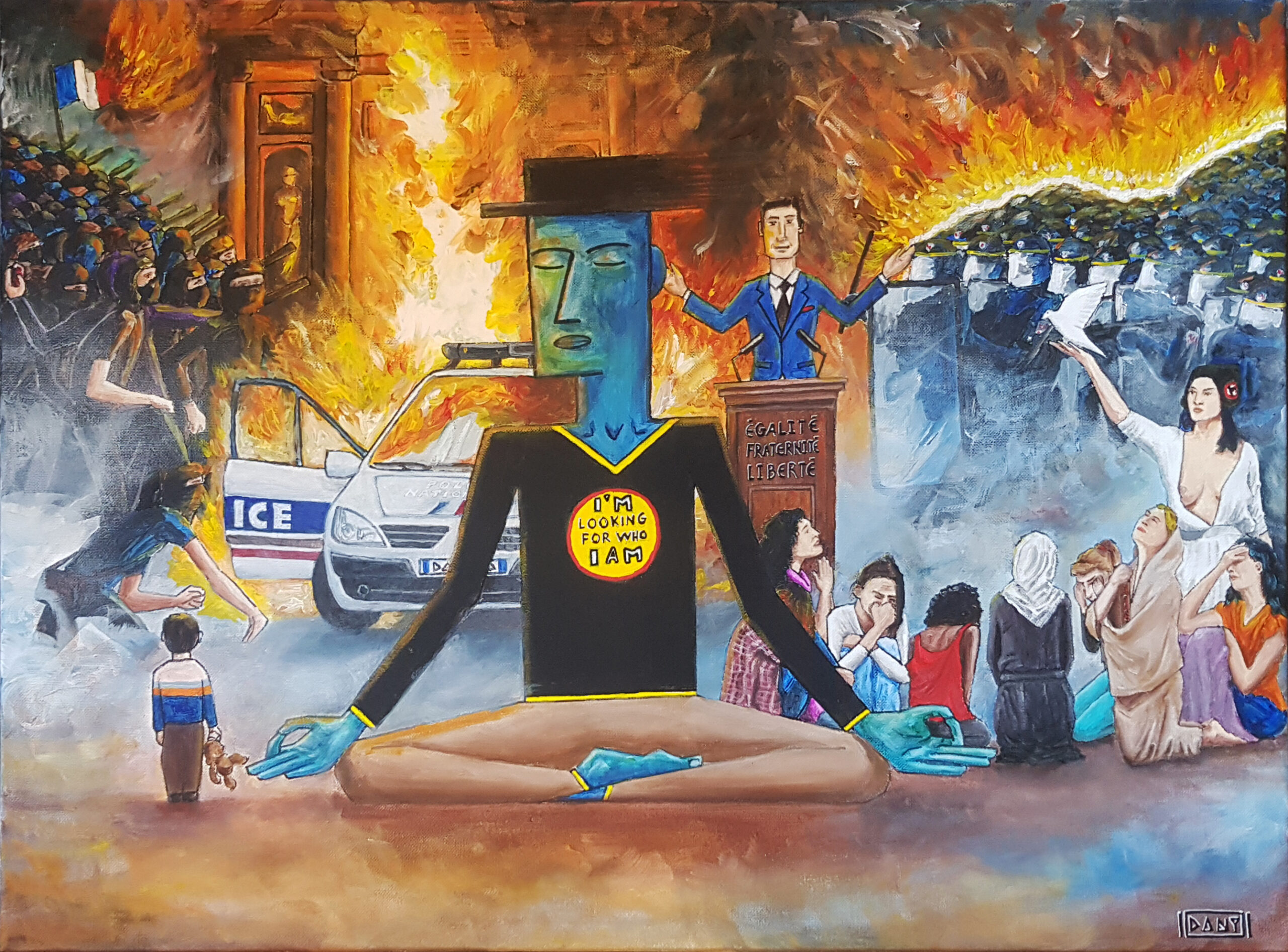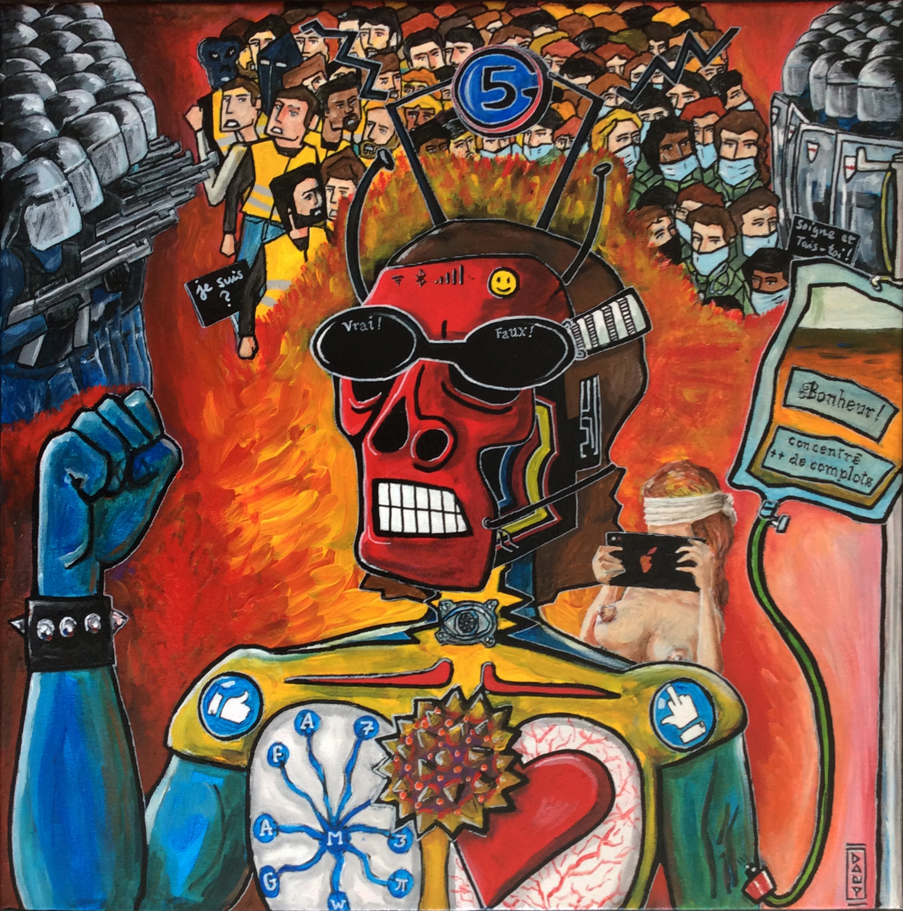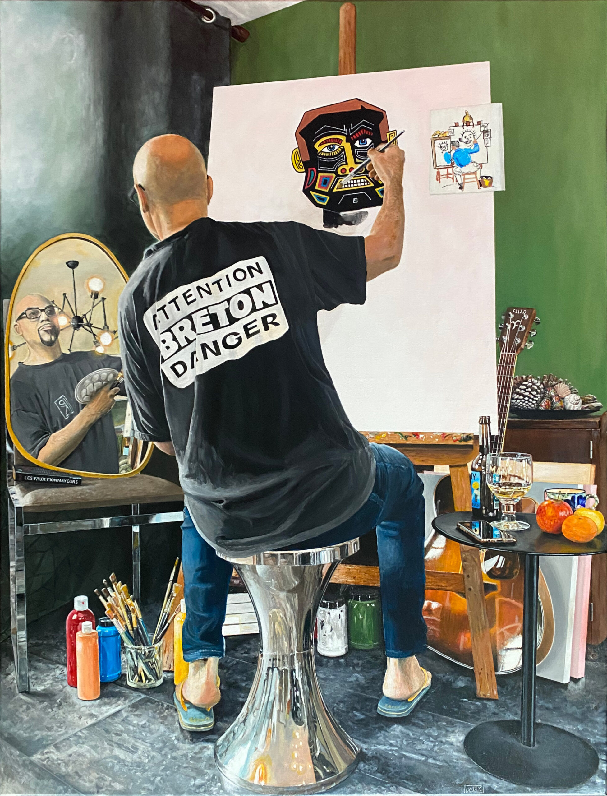 Le cadre “carré” agit ici comme un masque universel, une architecture qui protège autant qu’elle expose. Si l’artiste s’y dissimule parfois, ces figures sont avant tout des réceptacles d’identités multiples, laissant au spectateur la liberté d’y projeter ses propres évidences. Qu’il s’agisse de masques sombres aux résonances archaïques ou de visages azurés à la part humaniste et méditative, la peinture ne cherche pas à dévoiler l’individu, mais à capturer l’essence de sa présence au monde. Une galerie de miroirs où l’identité n’est jamais figée, mais toujours suggérée.