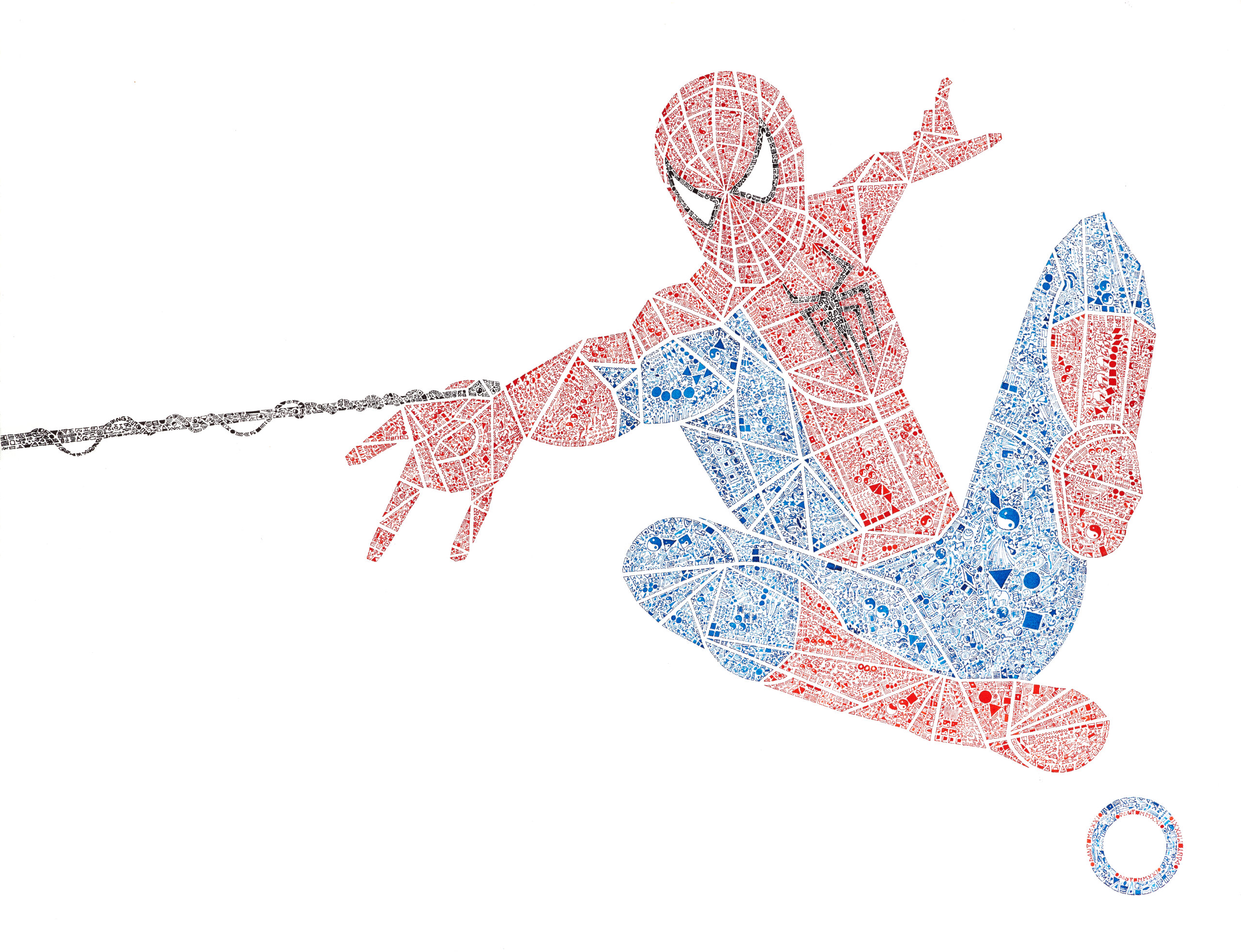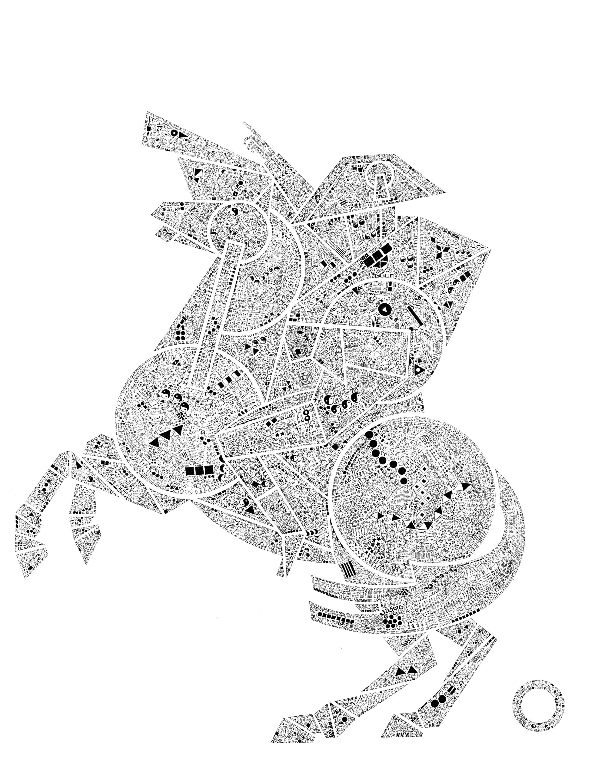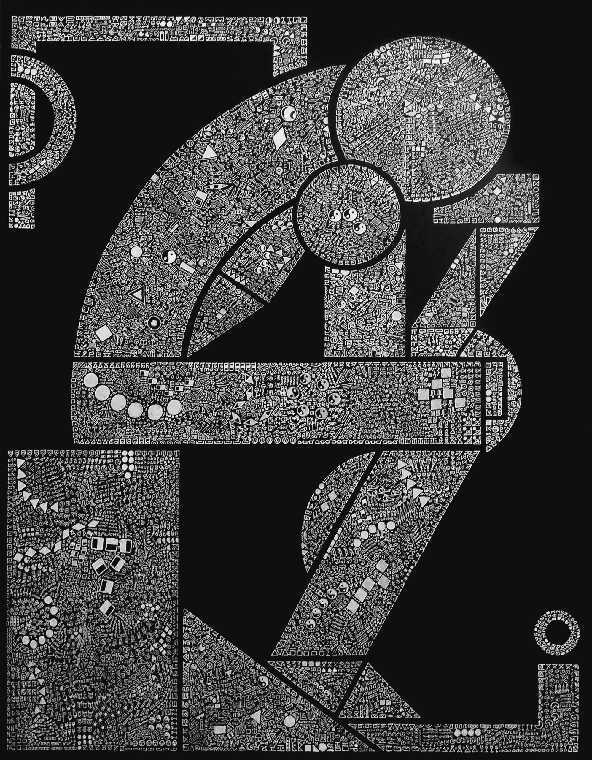 Chaque œuvre procède d’un remplissage intuitif : les formes géométriques sont investies de motifs répétés de façon aléatoire selon l’élan de l’artiste. Libéré de toute nomenclature stricte ou de message caché, ce processus de sédimentation du détail crée une trame vibrante qui donne corps à la figure. À travers ce prisme, l’individu devient une architecture de signes où le sens naît de l’accumulation et de la liberté du geste, invitant le spectateur à une exploration purement visuelle et imaginaire de notre propre complexité.